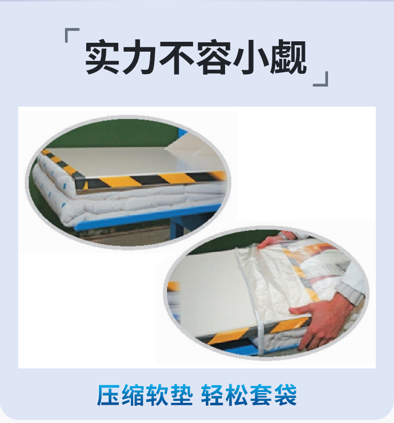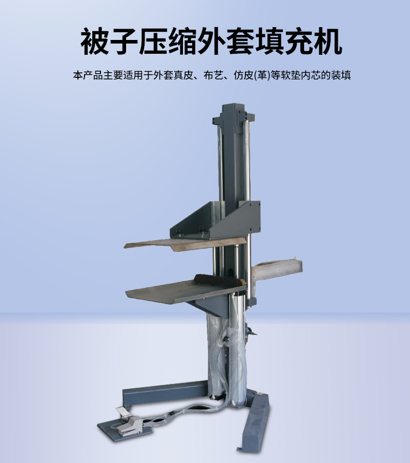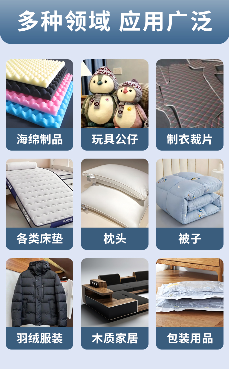 1.被子枕頭壓縮外套填充機(jī)適用于多個(gè)枕頭或者軟墊的壓縮套袋,針對于人工套袋費(fèi)時(shí)費(fèi)力而且套袋效果不平整的情況下,這款機(jī)器解決了以上難點(diǎn)。